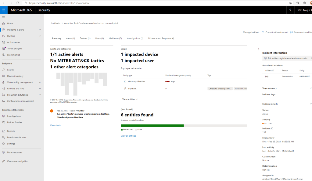 Incidents from M365D (formerly known as Microsoft Threat Protection or MTP) include all associated alerts, entities, and relevant information, providing you with enough context to perform triage and preliminary investigation in Azure Sentinel. Once in Sentinel, Incidents will remain bi-directionally synced with M365D, allowing you to take advantage of the benefits of both portals in your incident investigation.