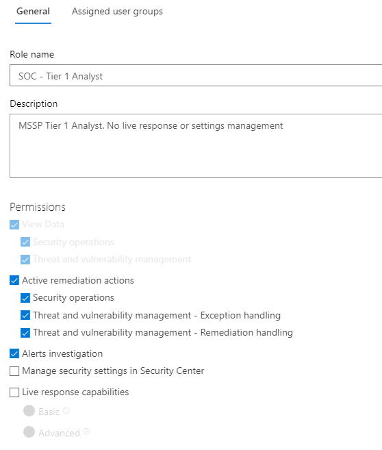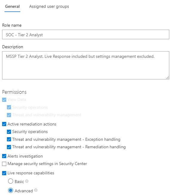 In M365D, enable RBAC usage and add just created Azure AD groups into admin roles. Tier-2 analyst group has “live response capabilities” addition to Tier-2 group.