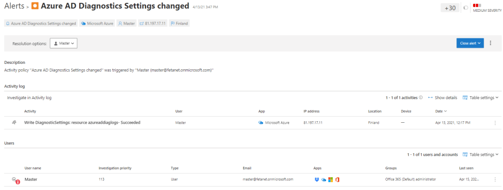 https://fetanet.portal.cloudappsecurity.com/#/audits/?service=eq(i:12260,)&activity.eventType=eq(12260:EVENT_AZURE_GENERIC:microsoft.aadiam%2FdiagnosticSettings%2Fwrite,)&activityObject=eq(%2Fproviders%2Fmicrosoft.aadiam%2FdiagnosticSettings%2Fazureaddiaglogs,)