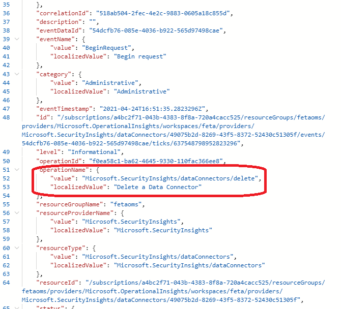 | where OperationNameValue contains "MICROSOFT.SECURITYINSIGHTS/DATACONNECTORS/DELETE"