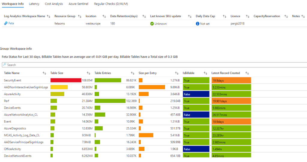 The workbook has lots of information from the workspace activity such as detailed information about the tables, latencies, cost analysis and Azure Sentinel related data types & other relevant information. Extremely valuable workbook that can be used for analyzing Azure Sentinel & Log Analytics workspace status.