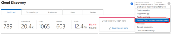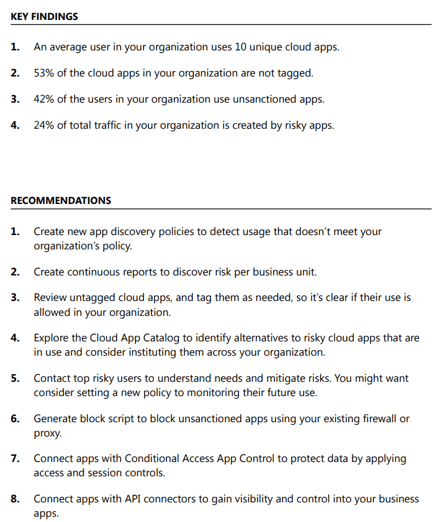 When data has been ingested to MCAS where to start? I often receive this question and one way to start is by running ‘Cloud Discovery Executive’ report from Cloud App Security ‘Cloud Discovery’ dashboard to get overall understanding of SaaS application usage in your environment. The report highlights the key findings and recommendations for further actions.