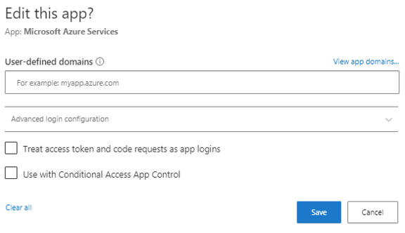 Session controls in Microsoft Cloud App Security can be configured to work with any web apps as mentioned before. If application is not found from the Cloud App Security app catalog, it will appear in the dialog under unidentified apps along with the login URL. When you click the + sign for these apps, you can onboard the application as a custom app.