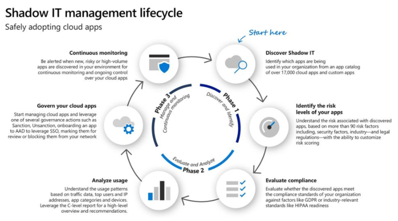 Phases 1 & 2 are not covered in this blog, the focus is on phase 3: Govern & Monitor Cloud Apps’. Detailed information from different phases is found: Discover and manage Shadow IT tutorial | Microsoft Docs