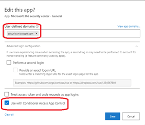In the example below, I have added Microsoft Defender 365 portal (security.microsoft.com) as a custom application, as it is currently not automatically recognized. The app is also onboarded to the Conditional Access App control for session controls.