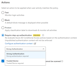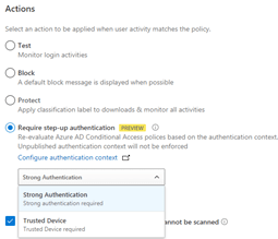 When this action is selected, Cloud App Security will redirect the session to Azure AD Conditional Access for policy re-evaluation, whenever the selected activity occurs. Based on the configured authentication context in Azure AD, claims request (challenge) such as multi-factor authentication and device compliance can be checked during a session.
