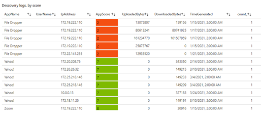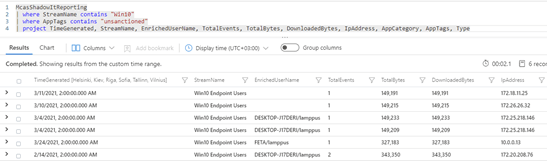 Use the filters (on top of workbook) to drill down to apps details. Example below contains unsanctioned app from two different reports, Win10 Endpoint users & ‘Cloud App Security Proxy’.