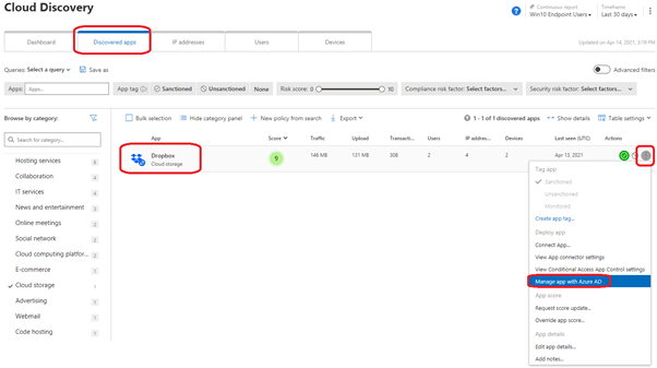 Decide whether an application is valid and allowed or prohibited to use in the organization. Admin can decide how to proceed with the application and assign “sanctioned”, “unsanctioned” or “Monitored“ tag to application (at the time of writing). The custom tags can be then used for specific monitoring purposes and filtering Cloud Discovery pages and creating policies.