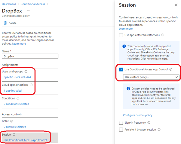 - Under Access Controls – Sessions – select Use Conditional Access App Control and choose a built-in policy (Monitor only or Block downloads) or Use custom policy to set an advanced policy in Cloud App Security, and then click Select.
