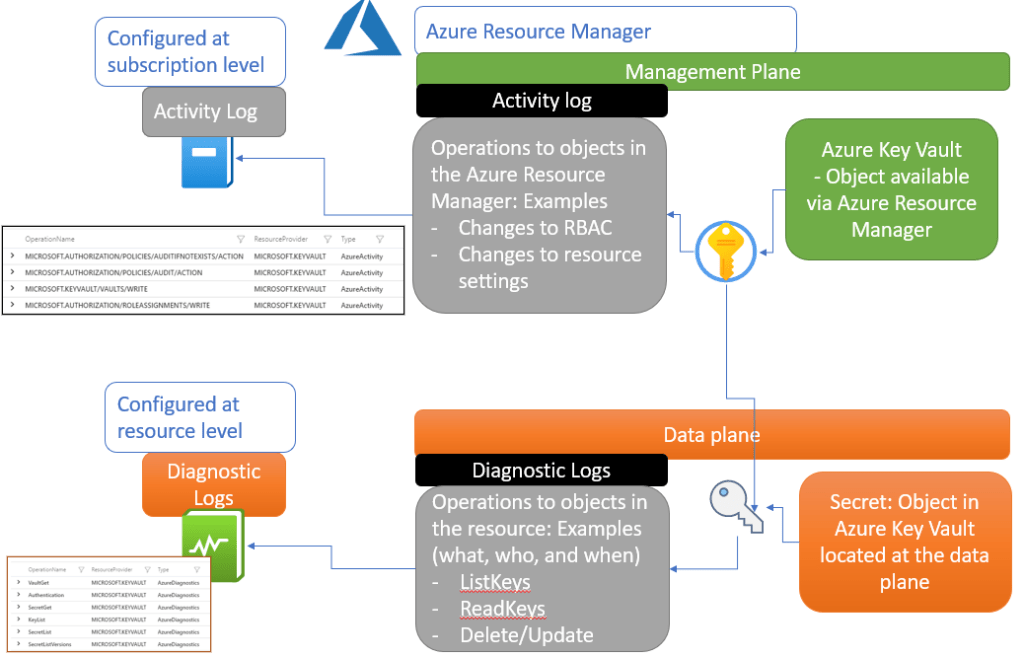 In Azure resources side it’s critical to cover both, management & data plane activities in the audit monitoring strategy. Azure Activity Log contains operations in the Azure Resource Manager (ARM) level but not operations to objects in the resources. The latter one is configured with Azure diagnostics settings and is often overlooked.