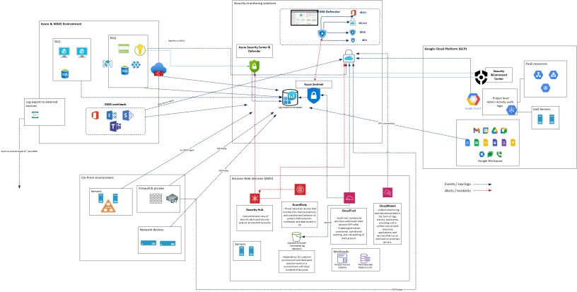 Base of the architecture is one example case I have been working with. The idea in this architecture is to leverage Microsoft security solutions as much as possible in security monitoring & posture management. In the picture below, there are four (4) major log sources sending audit trail (alerts, data & signal, events / raw logs, recommendations, etc) to Microsoft security solutions (Azure Sentinel, Azure Security Center & Cloud App Security).