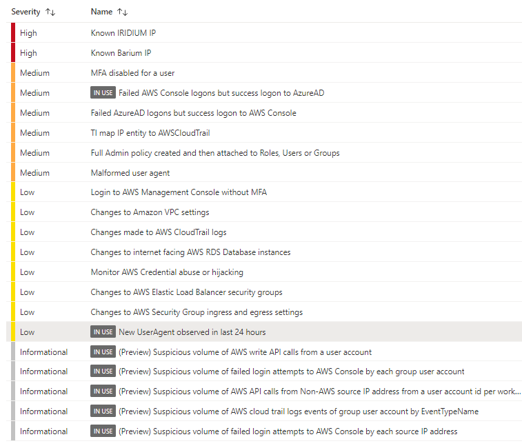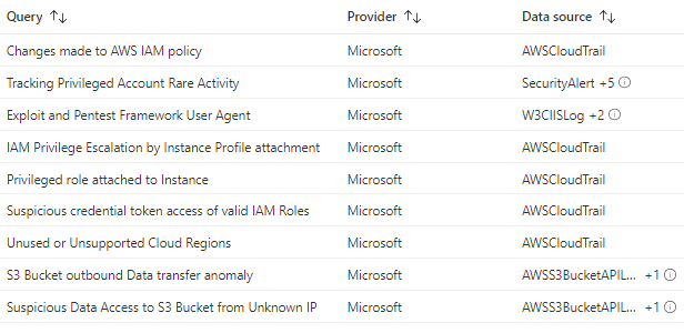 At the time of writing, there are the following analytics rules available out of the box (which uses AWS audit data). The data tables that contain the AWS data are: