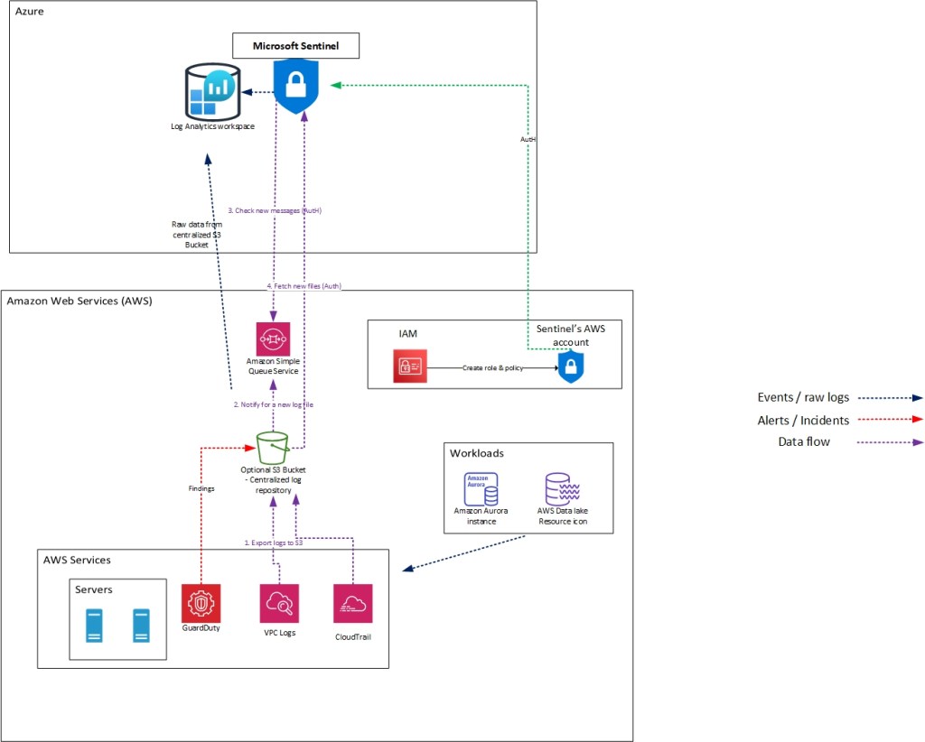 - In the AWS environment configure the services (VPC logs, CloudTrail & GuardDuty Findings) send logs to the S3 bucket which you would like to have in Microsoft Sentinel.