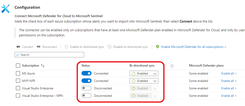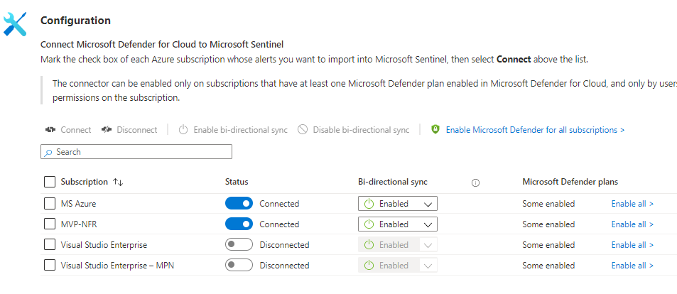 Defender for Cloud data connector is a built-in Microsoft connector and extremely easy to configure from the portal. When you enable (connect) the data connector the bi-directional sync is enabled at the same time. To establish you need to have “security admin/write” permission on the target Azure subscription.