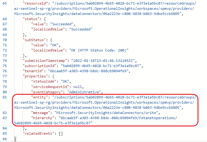 The following REST API call enables the connector from the Sentinel side. PowerShell used in tests I made and for that reason, there is formatting that’s required by PS included in the body.