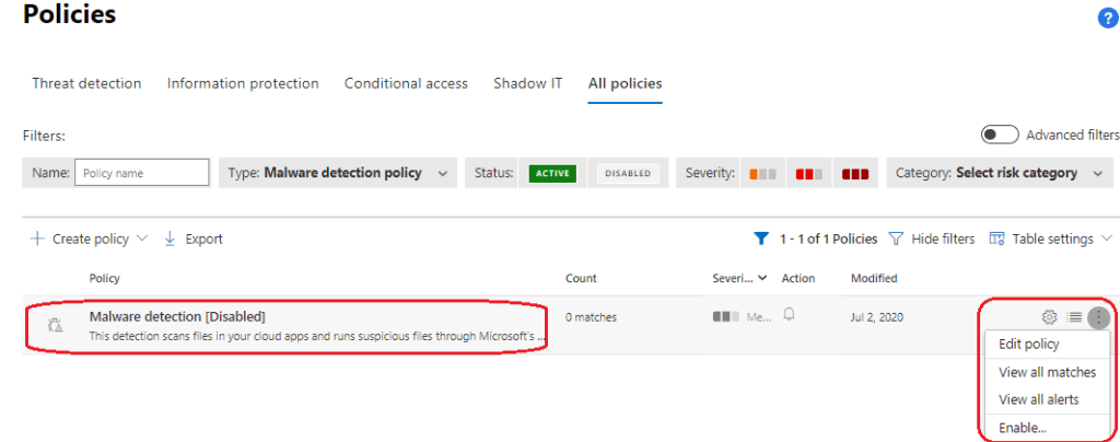 - Enable ‘Malware detection’ policy