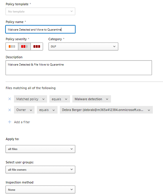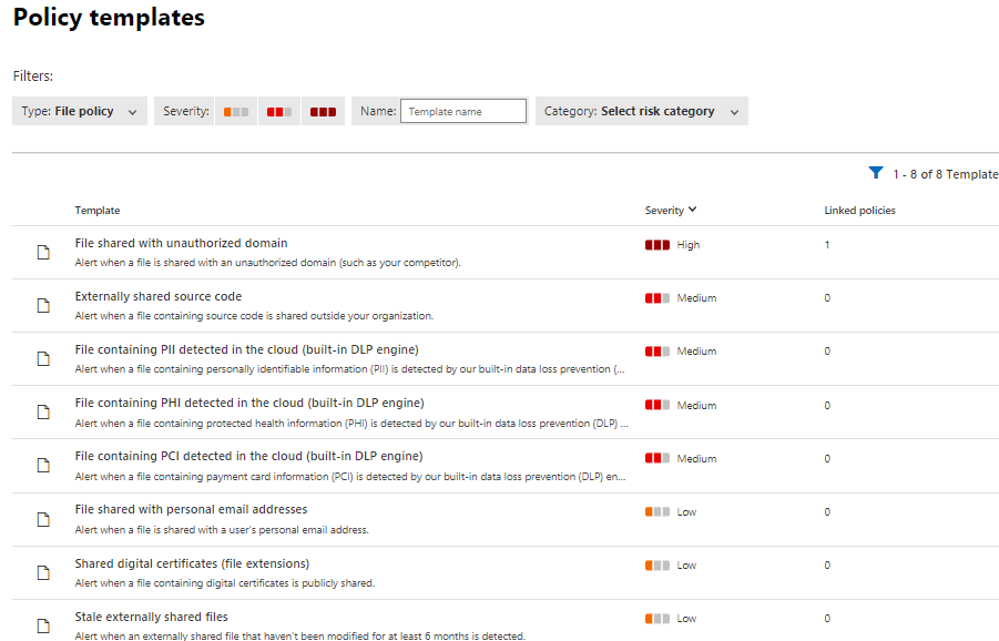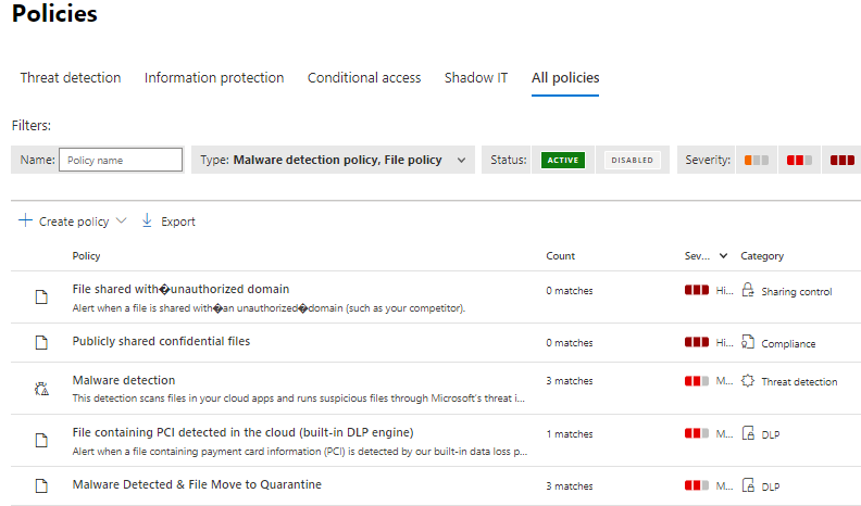 MDA offers a wide range of built-in policies for different scenarios and a possibility to create custom policies based on organization needs. From the pictures below you can find active policies on the left and policy templates on the right (malware policy is in its own category).