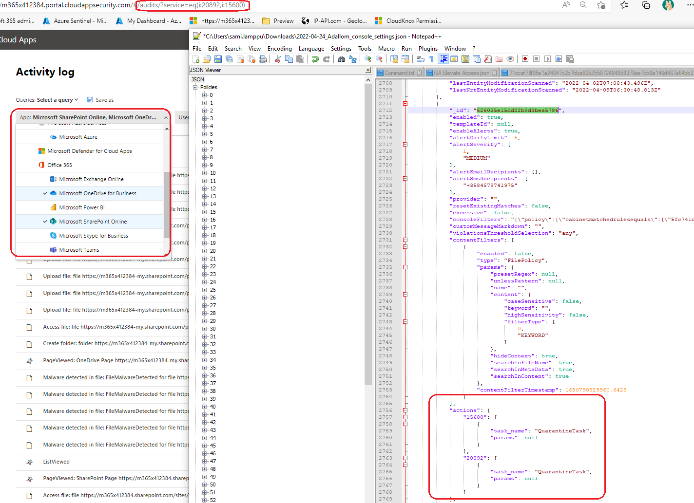 https://m365x412384.portal.cloudappsecurity.com/#/audits/?activity.eventType=eq(15600:EVENT_O365_TASK_QUARANTINE_FILE:quarantineFile,20892:EVENT_O365_TASK_QUARANTINE_FILE:quarantineFile,15600:EVENT_O365_TASK_TRASH_FILE:trashFile,20892:EVENT_O365_TASK_TRASH_FILE:trashFile,15600:EVENT_O365_ONEDRIVE_FILE_MALWARE_DETECTED:FileMalwareDetected,20892:EVENT_O365_SP_FILE_MALWARE_DETECTED:FileMalwareDetected)