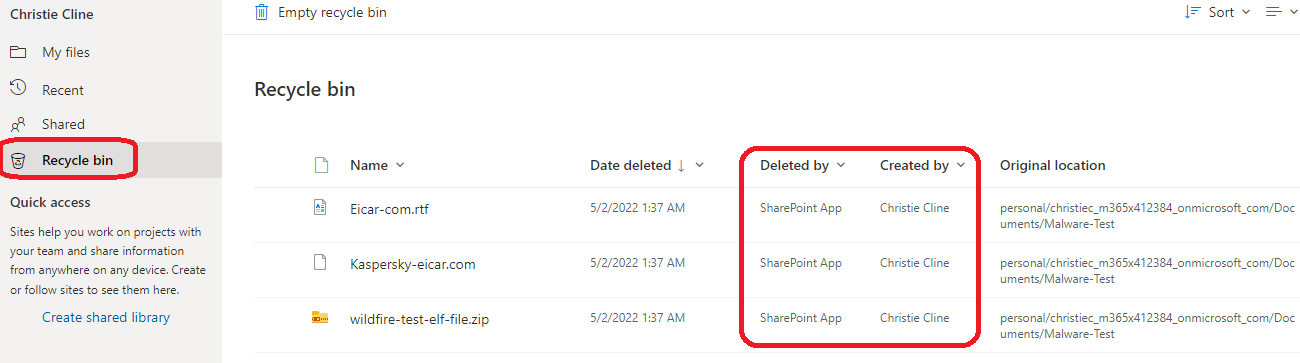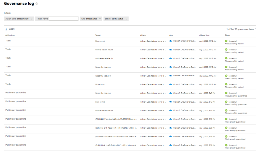 Disclaimer: Even though I’ve demonstrated all scenarios (malware detection & governance actions quarantine & trash) found in this blog in my own demo environment the scenarios were verified in the production environment. In both environments, the latency and behavior were identical.