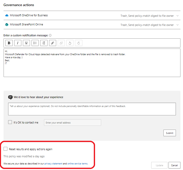 Bottom of the policy configuration you can find the check box “Reset results and apply actions again”. By checking this and saving the policy you can trigger the policy to run governance actions again for all detected files. By triggering this we’ve been able to clean malware detected files by MDA from the O365 workloads and move those ones to the quarantine/trash folder.