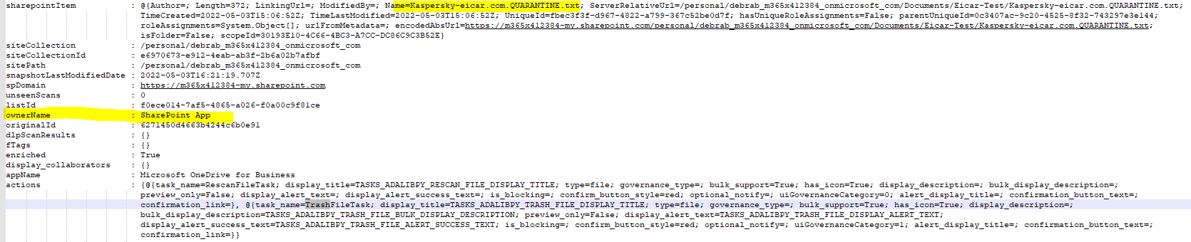 Even though, I’m not a fan of the ‘Defender for Cloud Apps’ API it offers even more detailed information about the files as you can see below. Because governance actions are made the file is owned by the ‘SharePoint’ app.