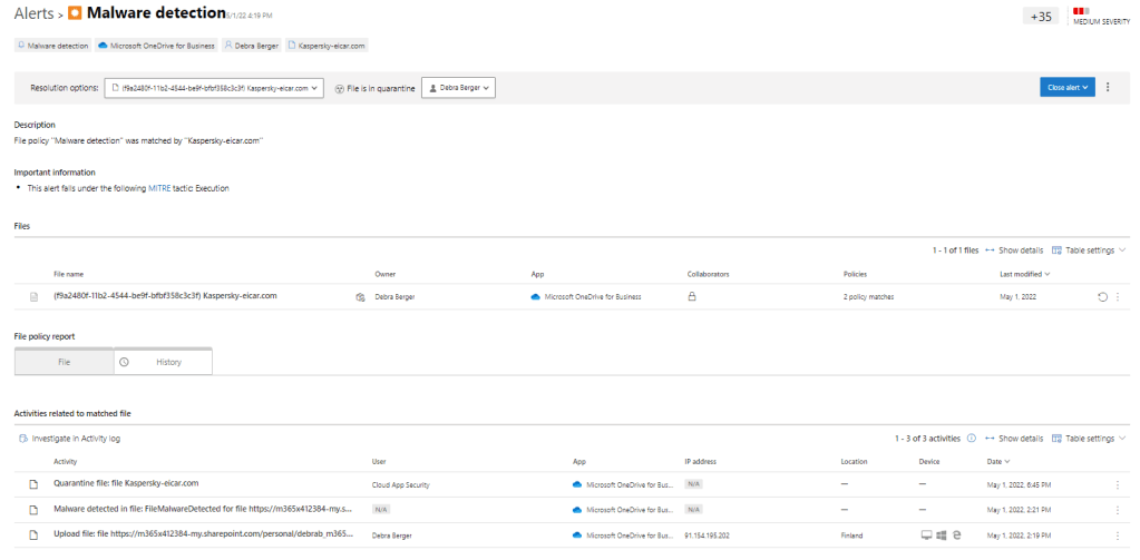 When malware is detected by a built-in policy an alert is created to the alert queue and detailed information is found on the alert page. From the history sheet, you can find possible governance activities made to the file which is very beneficial information. The governance actions are also found in the governance log (located underneath settings).