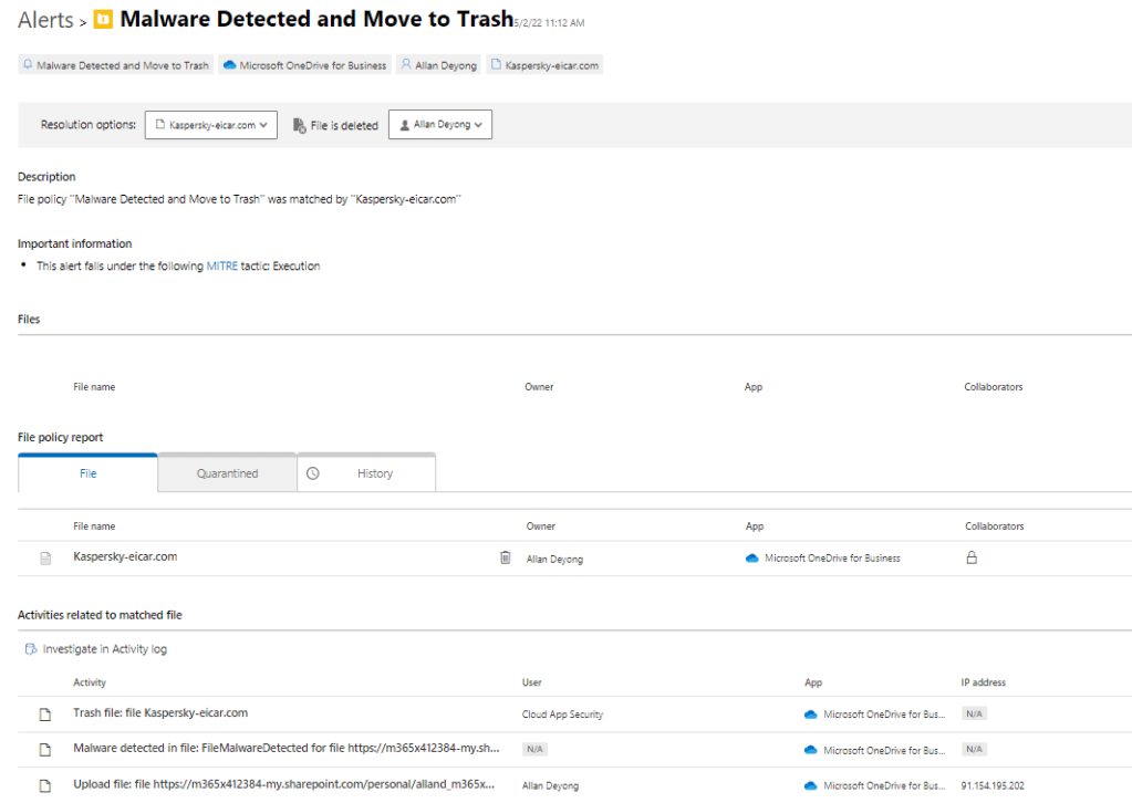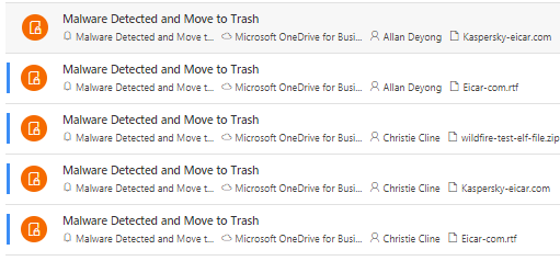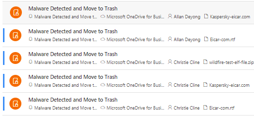- O365 workloads (ODfb, SPO, EXO) detects malware-infected file very quickly (in minutes) but before the MDA malware detection policy kicks in, detecting the file & creates an alert can take hours