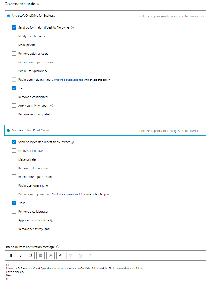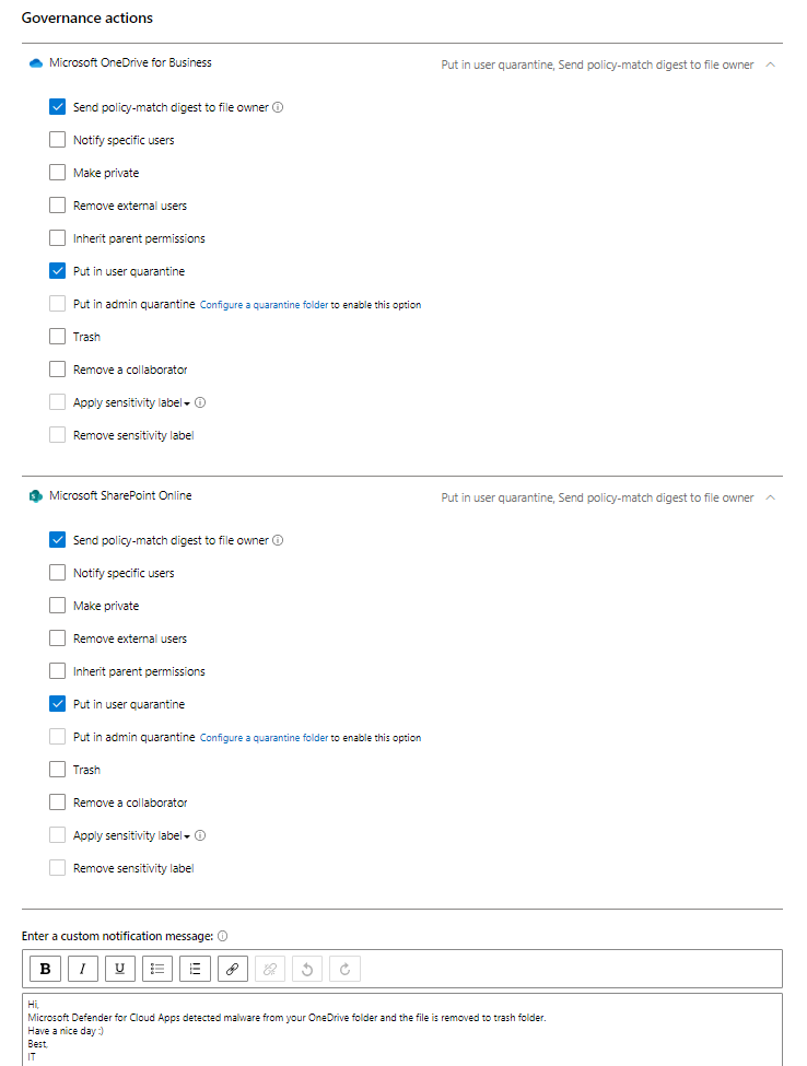 When policy is run and it detects malware & performs governance actions the following actions will take place (OneDrive as an example):