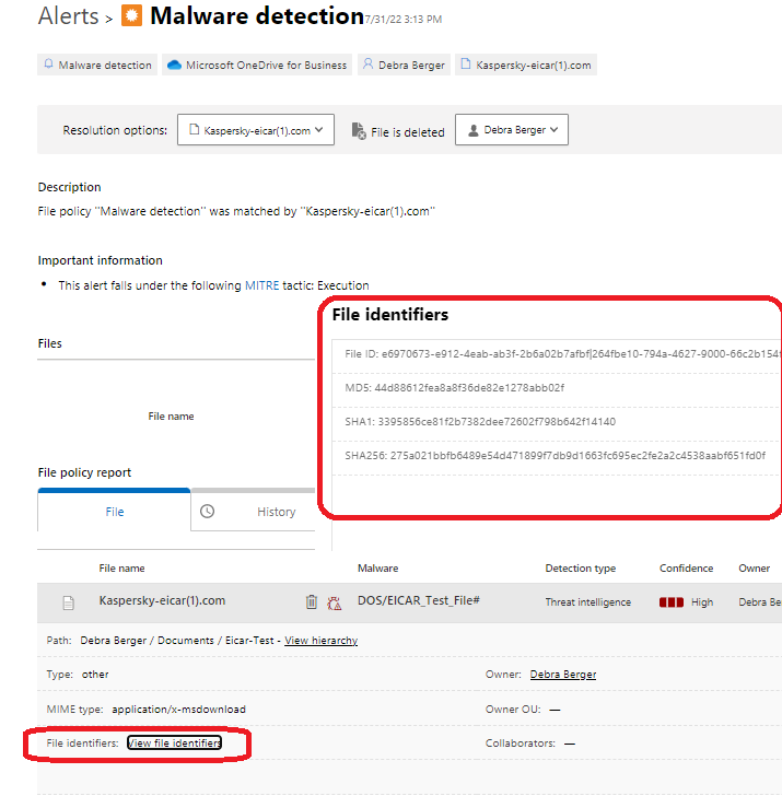 In addition to file hashes available for malware detected in non-Microsoft storage apps, now new malware detection alerts will provide hashes for malware detected in SharePoint and OneDrive.