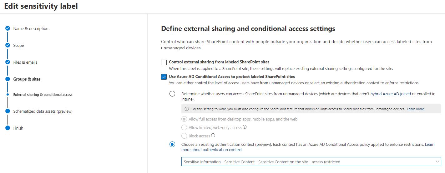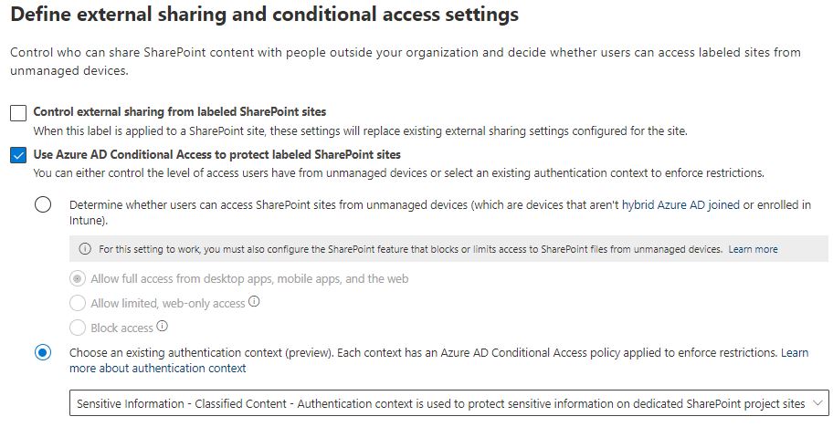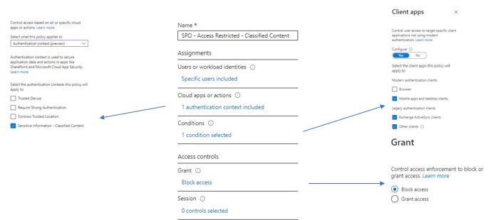On SharePoint Online, we need to label the site that contains sensitive material. Because the label has been associated with an authentication context (previous chapter). SPO will then demand the authentication context be used via the Azure AD Conditional Access policy.