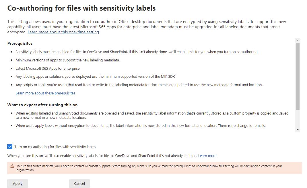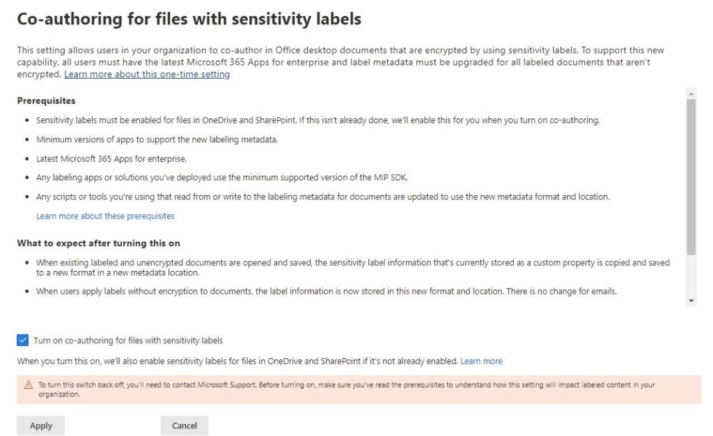 Side note: If you enable co-authoring for files with sensitivity labels, the labels are enabled automatically in Onedrive & SharePoint.