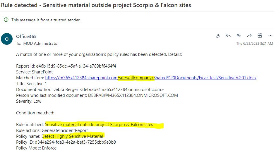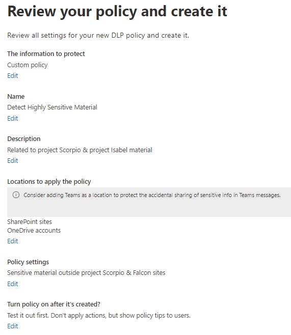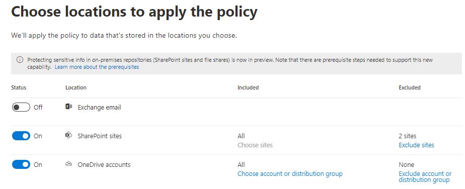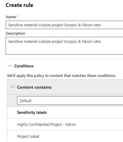- A DLP policy to detect sensitivity labels from SPO & ODfB from all other sites than the ones that contain sensitive material. The idea of using the DLP policy is to detect if sensitive material is saved to the another location