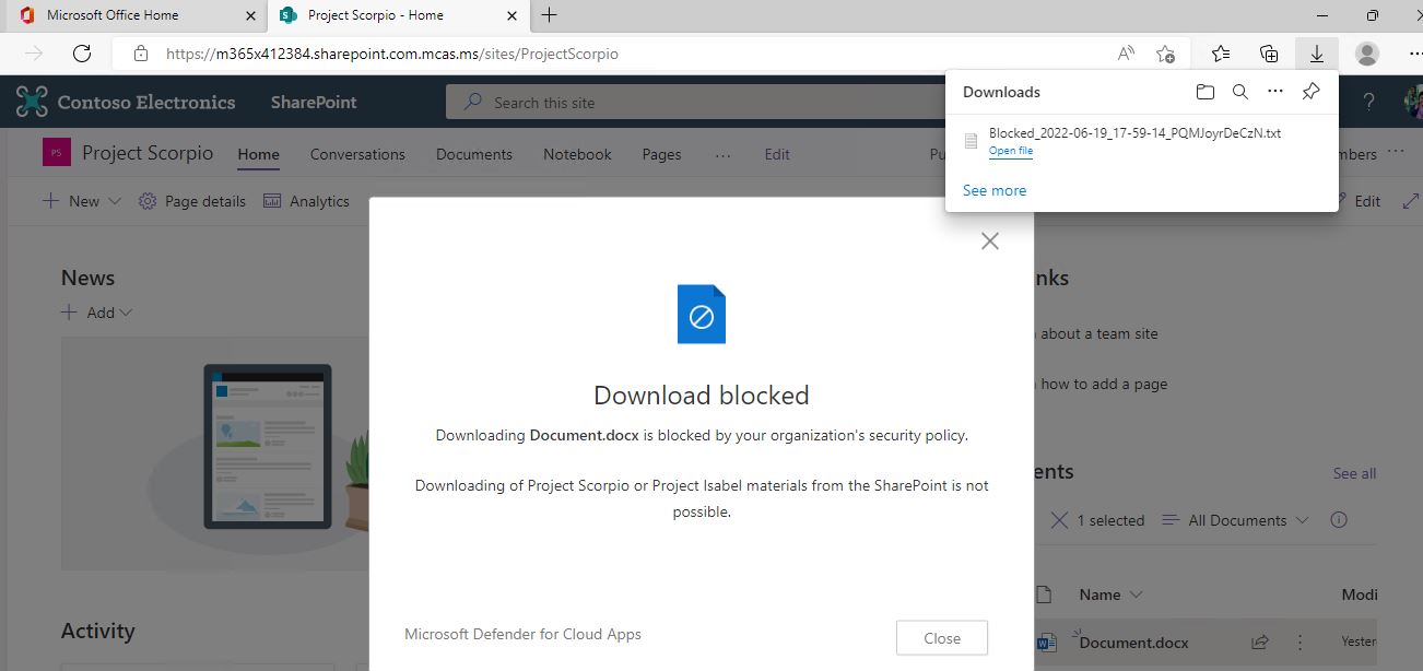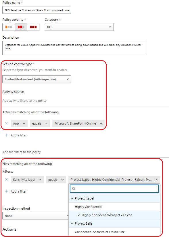 - A custom policy that blocks download when the sensitive label is detected. The custom policy uses built-in MDA – MIP integration and content inspection