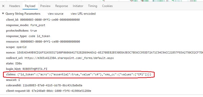 From the browser trace or in Fiddler, we can see the id (c4) of the authentication context in claims.
