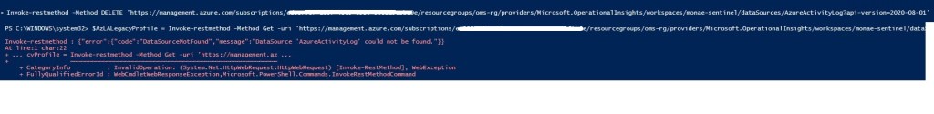 $DeleteLegacyProfile = Invoke-restmethod -Method DELETE 'https://management.azure.com/subscriptions/<Subscription Id>/resourcegroups/<LAWS-rg>/providers/Microsoft.OperationalInsights/workspaces/<LAWS Name>/dataSources/AzureActivityLog?api-version=2020-08-01' -ContentType "application/json" -Headers $h