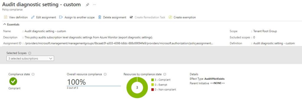 Azure Policy contains a built-in policy (Audit diagnostic settings) that is created initially for resource diagnostic settings auditing purposes. Based on my experience, it doesn’t work out of the box with Azure Activity Log because there is metric monitoring included. That being said, I created a custom policy that doesn’t include metrics and the outcome is desired.