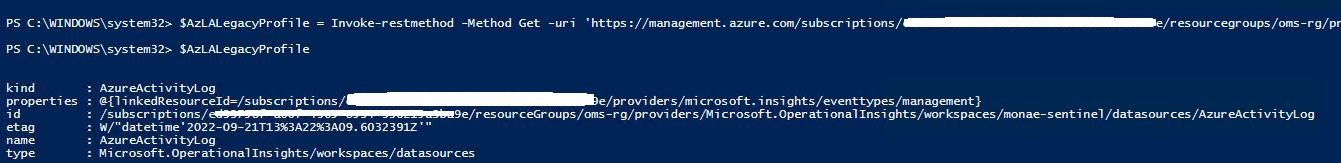 $SetLegacyProfile = Invoke-restmethod -Method Put -uri 'https://management.azure.com/subscriptions/<Subscription Id>/resourcegroups/<LAWS-rg>/providers/Microsoft.OperationalInsights/workspaces/<LAWS Name>/dataSources/AzureActivityLog?api-version=2020-08-01' -body $body -ContentType "application/json" -Headers $h