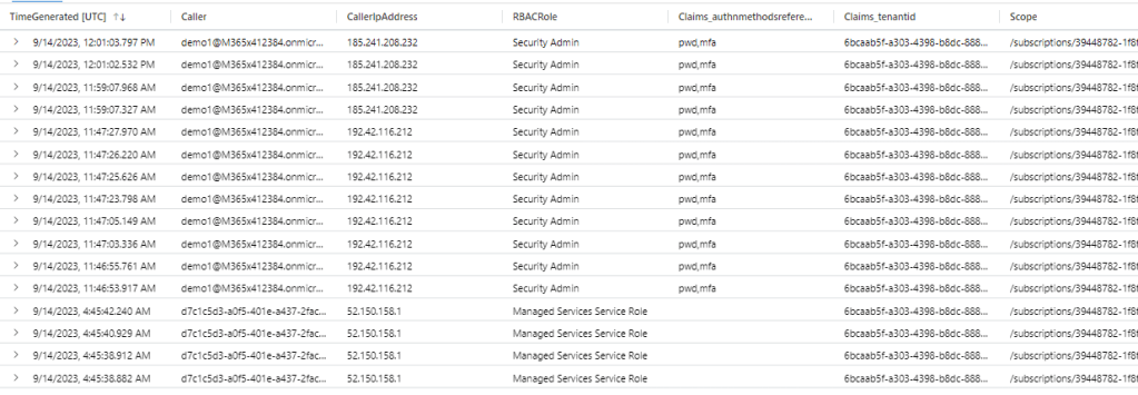 | project TimeGenerated, Caller, CallerIpAddress, ['RBACRole'], ['Claims_authnmethodsreferences'], ['Claims_tenantid'], ['Scope']