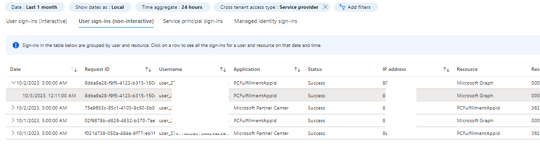 Side note: If you are keen to find out sign-in activities by Cloud Service Provider (CSP) who access to the tenant through Partner Center, you can find sign-in activities from Entra ID sign-in logs by using filter ‘Cross-tenant access type: Service Provider’. There are other access types also available for monitoring B2B or Microsoft Support access.