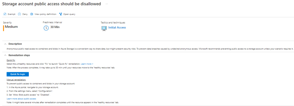 In Defender for Cloud (MDC), there is a proactive mechanism (AzPolicy) that detects storage accounts with public access from your environment. It’s all about Cloud Security Posture Management (CSPM) and requires someone to look after the recommendations (process & responsibility) and if there is an adversary doing activities, or misconfiguration by admin you most probably want to act quickly. This is where the detection rule (Sentinel / Monitor) comes into the game.