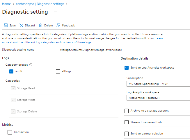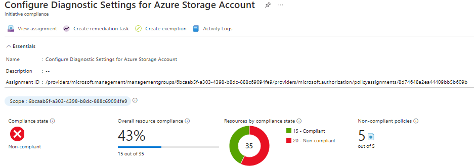 If an organization has an Infra-as-a-Code (IaC) approach needed settings can be configured on the DevOps platform when creating resources in the first place. An alternative approach is to configure diagnostic settings for an Azure storage account is the Azure Policy. There are several approaches here but I’ve done it by creating a policy initiative that contains all storage account services + storage account metrics log.
