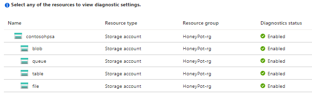 The outcome will look something like in the figures below where you can see diagnostic settings and status on the Azure storage account level.