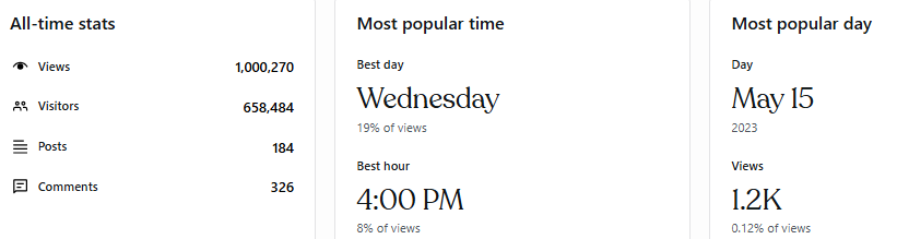 Today, I’ve written a total of 185 posts for the platform. It means multiple hours spent writing content that I think is meaningful for me and the community. Here is a summary of the stats: